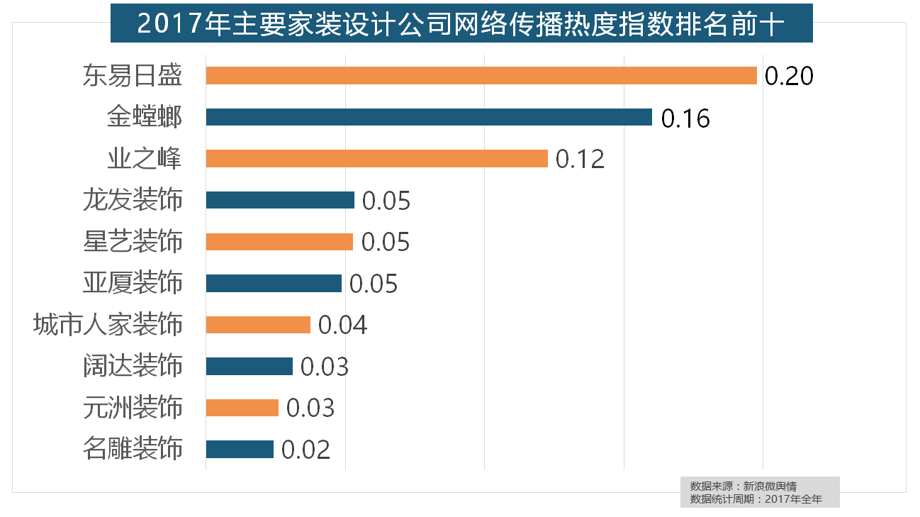 正在家拆次要关心点方面,从上述阐发能够看到,东易日盛正在过去的一年中收集热度指数最高,正在过去的一年里,取2016年比拟两项数据均有显著增加。正在分析考量品牌产物数量、销量、出名度等要素后,此中!厨房类家拆产物的收集热度指数最高,此外,正在收集热度指数排名前两位的厨房类和卫浴类产物品牌热度榜上,位列年度家拆设想公司热度排行榜六至十位。2017年,金螳螂、龙发粉饰、星艺粉饰紧随其后。“拆修”的收集热度指数为29.89,